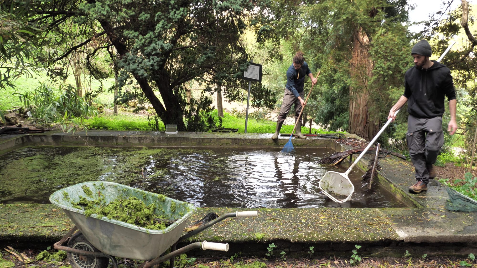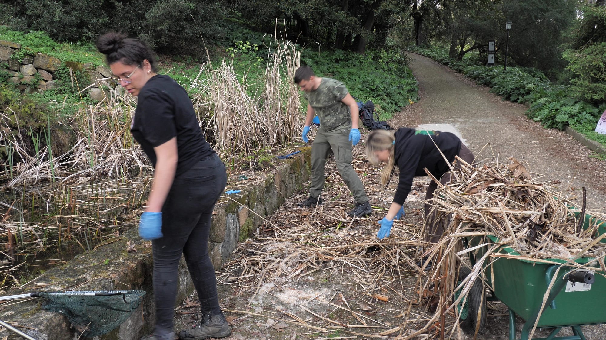 Le varie fasi della pulizia degli stagni, compresa la rimozione della Lemna minuta, una macrofita acquatica invasiva e biocida. La pulizia degli stagni e la rimozione di parte della vegetazione, se invasiva, fa parte della normale manutenzione ordinaria necessaria per preservare l'equilibrio di questi piccoli e delicati ecosistemi.